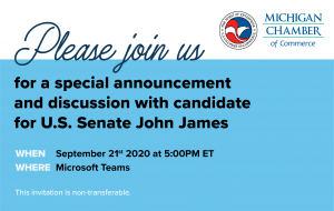 Please join us on Monday, September 21 for a special virtual event featuring Candidate for U.S. Senate, John James. The event will begin at 5:00pm ET. Login details are included below.