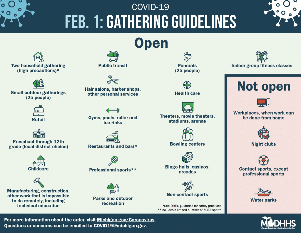 The Michigan Department of Health and Human Services (MDHHS) released the newest epidemic order affecting businesses and certain gatherings today which will go into effect February 1st. The order will allow for indoor dining at restaurants with certain requirements; concessions at casinos, movie theaters and stadiums; personal services requiring mask removal; and non-residential gatherings of up to 10 people from two households. The new order will last three weeks, until Sunday, Feb. 21.